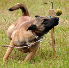 To samo eno veliko igračo postaviš na kakih 5-10m tako, da jo pes vidi, ko jo postavljaš - najbolje je, da leži na prostoru, če zna (zapomni si kje so tačke, da ne plazi). Pomaga rezervna igrača za hrbtom. Jaz sem uporabljal za Ayo eno veliko opico. Večkrat je doživela opercije šivanja, ker jo je Aya raztrančirala pa je opica še kar nekako sedela tam na koncu travnika in čakala, da jo Aya dobi v zobe :) Potem sem kupil v otroški trgovini enega medveda; vsaj 20-25cm mora bit visok - ko sedi, lahko pa pred njim zapičiš kakšen količek, da je še bolje viden in ko pes pobira izgleda vse skupaj kot nekakšno obkrožanje revirja. Tukaj se tudi najbolj vidi s katere strani psu najbolj paše it okrog količka (z leve ali z desne), kar kasneje uporabiš pri nastavljanju hrane na okrog obbrnjen PVC koš za smeti za revirjem - ampak, to je že druga tema ... Najbolje je torej, da psa prej malo spoznaš z novo igračo. Rečeš "prostor" in mu jo vržeš, da jo pes malo nauči reda :)) Ustvariš torej željo po igrači in zamenjaš za močnejšo hrano.